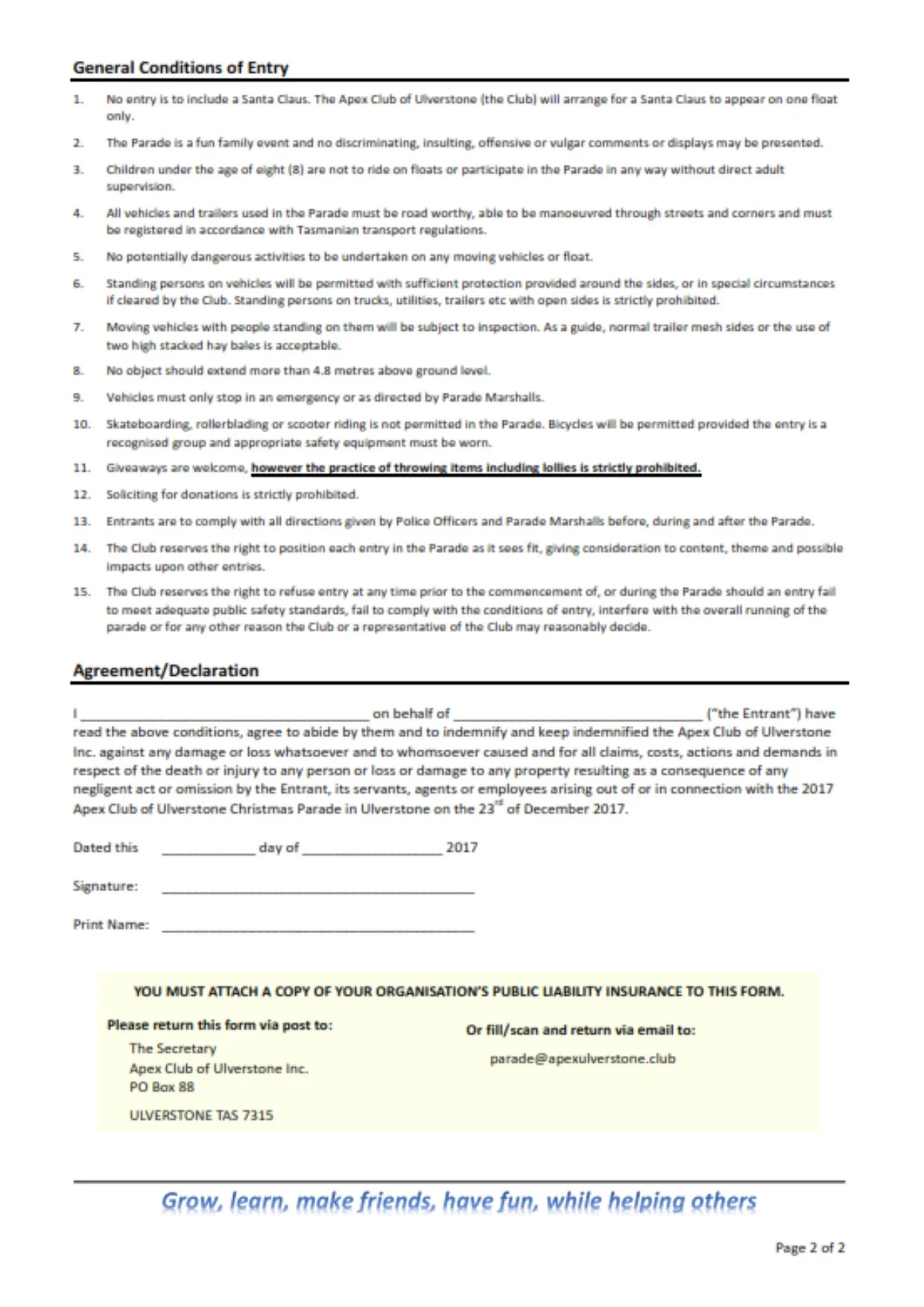 Anyone who would like to enter a float please print the attached PDF and return the completed entry form to the Apex Club via post or email.