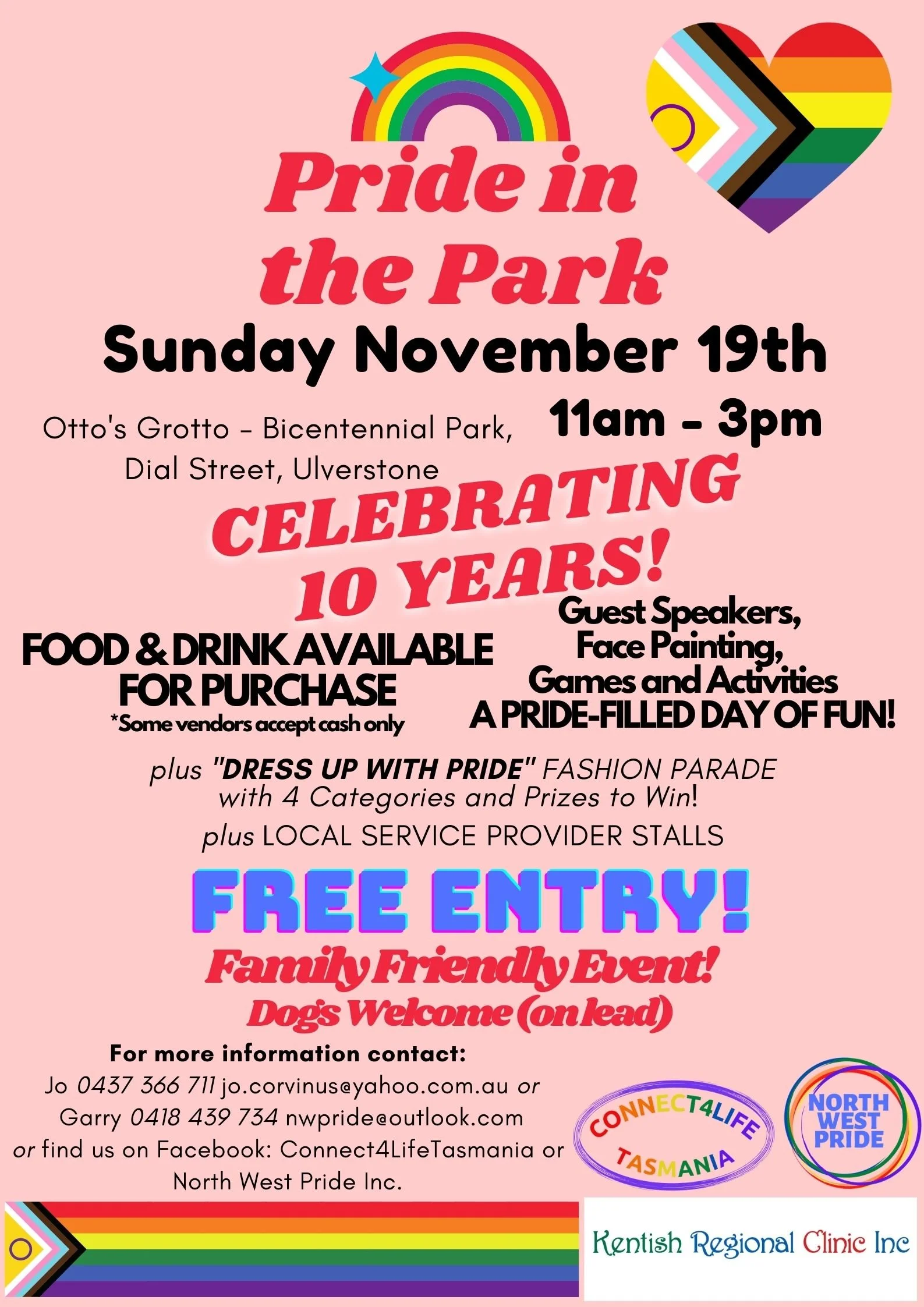Free entry but bring cash for food/coffee vendors and merchandise purchases. For further information email jo.corvinus@yahoo.com.au or nwpride@outlook.com or find us on Facebook at Connect4Life Tasmania.
