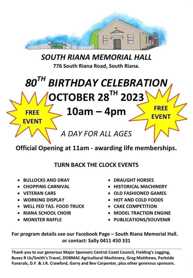 Welcome to the South Riana Memorial Hall’s 50th Anniversary Celebration on 25th October 2023.