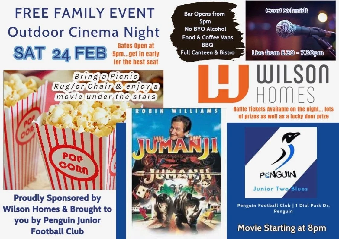 With the junior season fast approaching, Penguin Junior footy club would like to kick off the season with a Free Family Outdoor cinema night ! Live music and food vans . All Welcome , bring friends and family. Save the date!!