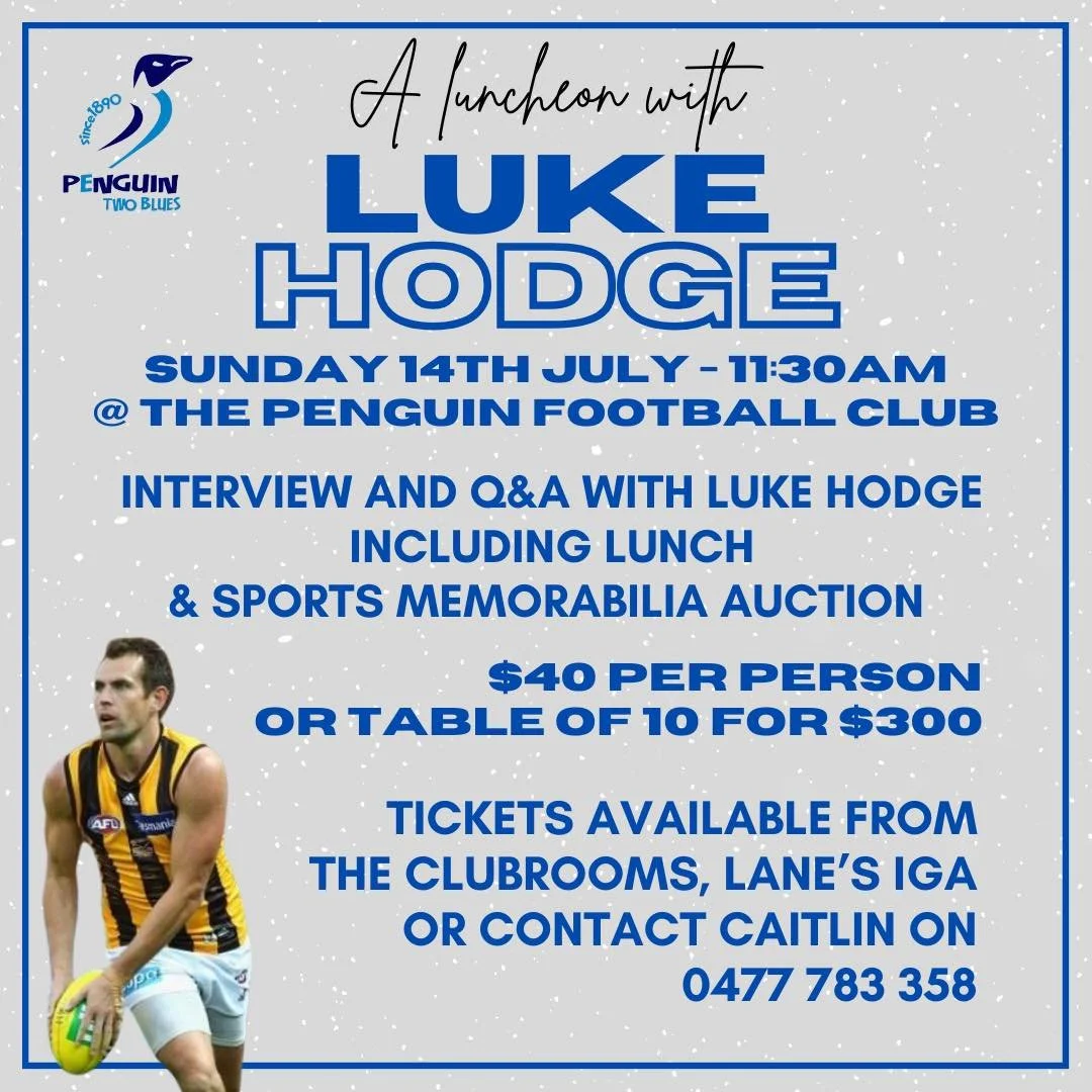 Join us for an interview and Q&A with Luke which includes lunch and a sports memorabilia auction. Tickets are $40 each, or $300 for a table of 10, and are available from the clubrooms, Lanes IGA Supermarket or by contacting Caitlin on 0477 783 358.
