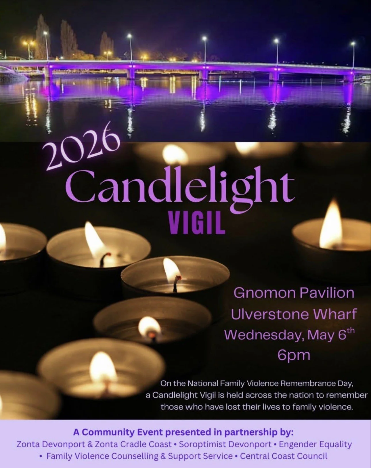 This is a joint community event by Zonta Devonport & Cradle Coast, Soroptimist Devonport, Engender Equality, Family Violence Counselling and Support Service and Central Coast Council.